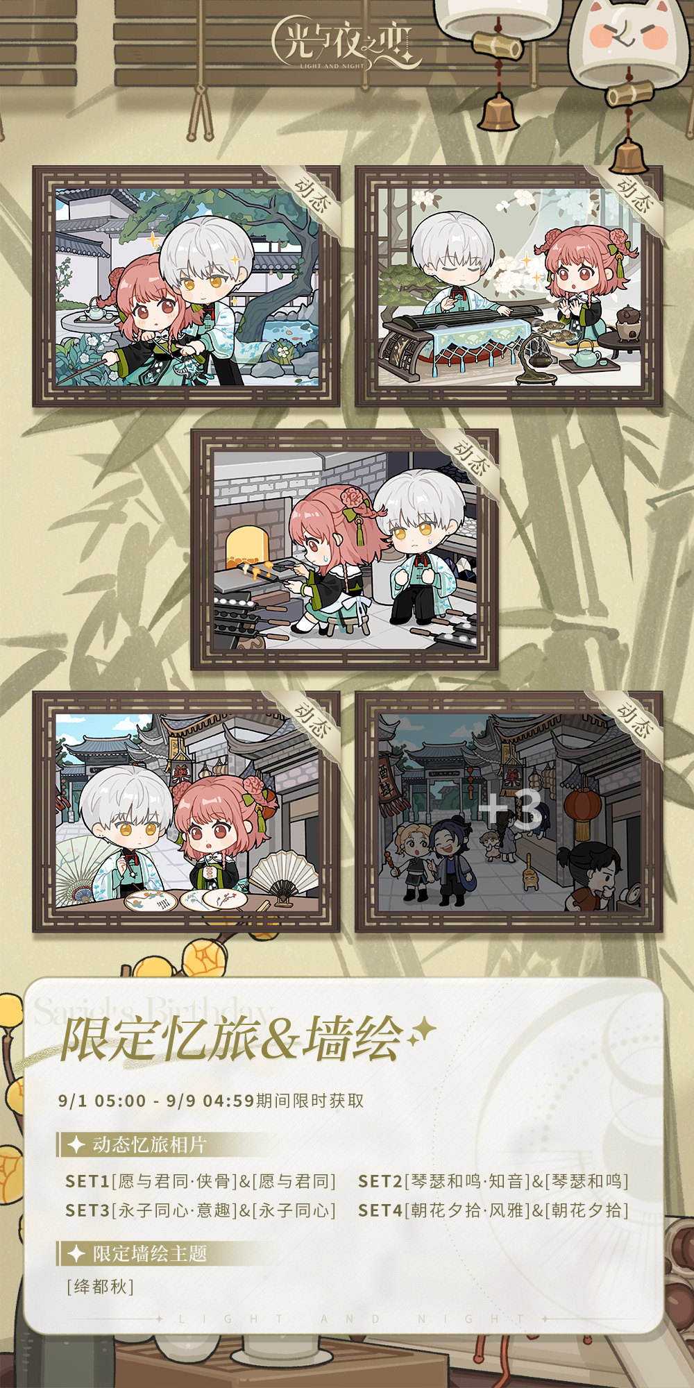 集齐齐司礼生日系列四组动态忆旅相片后,可在限时计划处领取限定墙绘[绛都秋]。