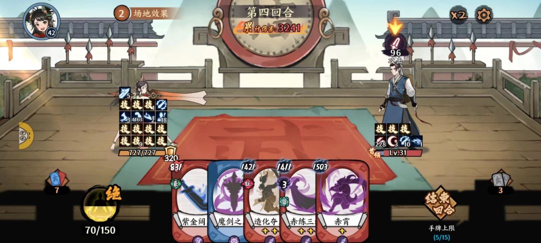 第4回合:开始疯狂过牌了,注意手牌不要超过15。先用灵猴,如果这时候还没抽到赤海茫茫可以SL了,会少很多伤害。注意,在力量叠起来之前不要使用任何攻击牌,会把暴击和重复招式浪费掉。用数值力量牌,把牌用到12张,用赤海复苏拿4张牌,这次把所有数值力量牌全用了(注意不要使用赤虎斩)。所有力量牌用完,后开始用因果斩,因果斩用完了的时候,如果弃牌库里有了因果斩,就使用赤魔再现(加易伤),然后用舍利决把因果斩和赤魔再现捞回来,再使用一次因果,然后使用帽子,再使用赤染刀刃(这个前面使用也行)。到此刻,所有猴戏已经完成,你会发现赤色怒斩有6000~7000的伤害,先用赤色怒斩触发暴击+重复,裂伤就要4000~6000了,然后补个造化夺刀(25%增伤),之后就用带裂伤的招式,然后用赤魔再现捞回来,再使用一次裂伤的。然后按伤害强弱把剩下的卡都用了。基本上裂伤可以叠到7000,随后几回合就是把这7000打完,伤害就有10万了。(当然不是把把10万,比如没吃到易伤就会少很多伤害。这个手法还有很多优化空间)