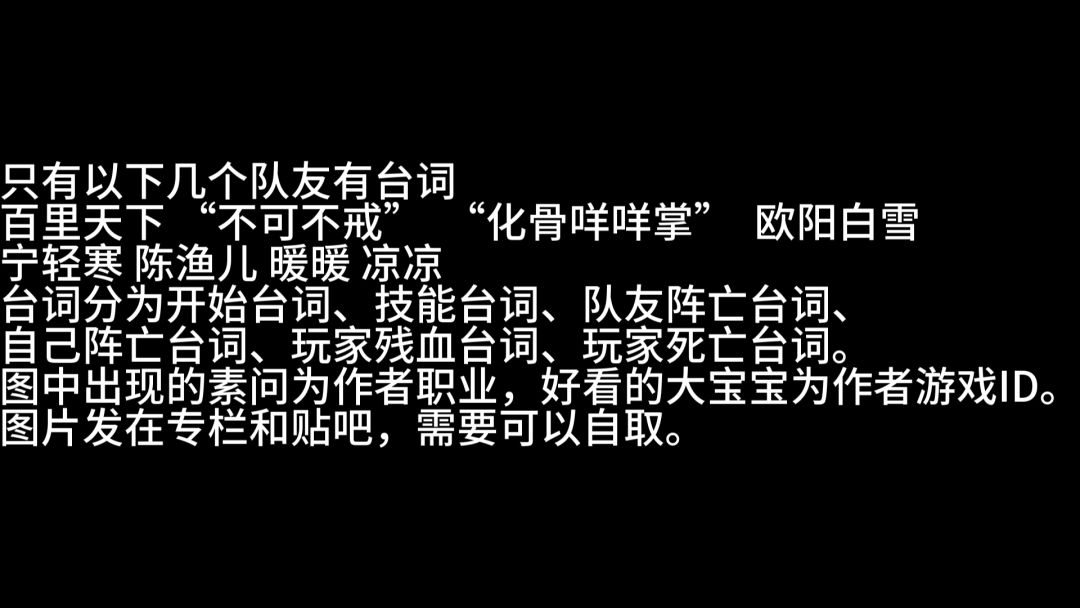 目前只有“不可不戒”、百里天下、欧阳白雪、“化骨咩咩掌”、暖暖、凉凉、宁轻寒、陈渔儿这几名队友有特殊台词