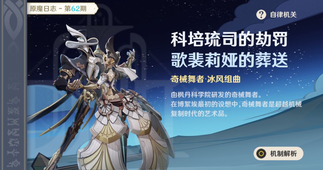 ●图鉴分类:自律机关。由枫丹科学院研发的奇械舞者。在博絮埃最初的设想中,奇械舞者是超越机械复制时代的艺术品。但在博絮埃被迫离任后,该项目改由梅雅德接手。梅雅德对于奇械和舞者均有自己独到的见解,因此在迭代过程中,奇械舞者的各项功能在臻于完备的同时,也逐渐偏离了博絮埃的设计初衷。