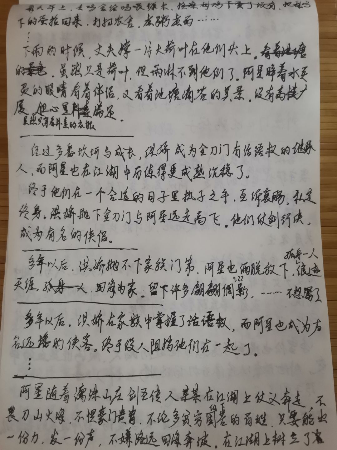 写了几个短的概括,以为总可以概括完他的人生故事了,包括翩翩少侠成无数少女梦中情人而不忘旧爱、将他托付于某位真心对他的大侠、(自认为完美结局之)洪娇阿星共同成长终成眷属远走高飞、抑或相望于江湖、抑或继承家业。以上至三点省略号横线为止。