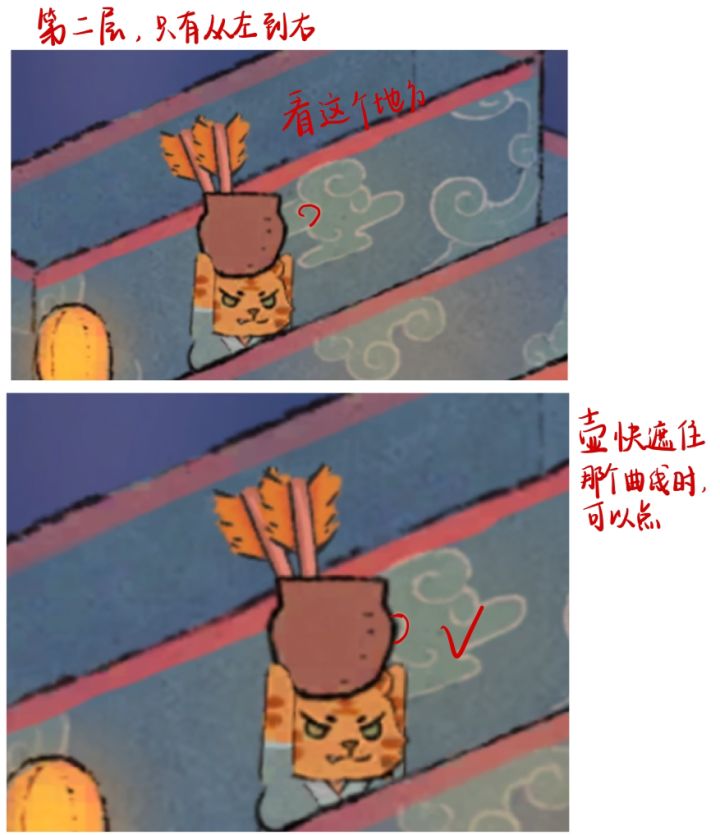 第三层比较简单,就是等壶从左边折返的时候,数一秒,然后迅速点一下箭。