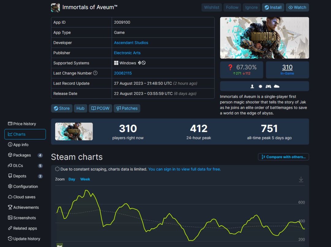 8月22日发售的魔法FPS游戏《不朽者传奇》销量不太乐观。根据SteamDB,该作在Steam上的在线峰值仅751人,甚至没有超过1000。游戏评论仅323篇,当前评价为“褒贬不一”。