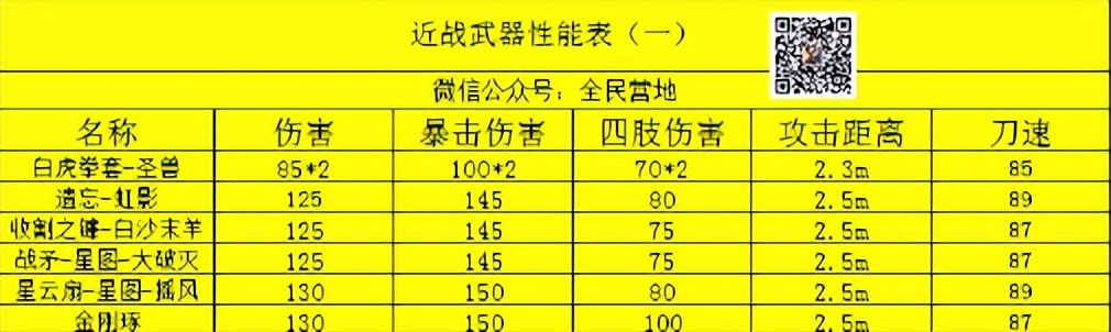 本文首发【全民营地】公众号,未经授权禁止“抄袭文章”转载至其它平台。哈喽,各位小伙伴们大家好,小s我啊在今天给大家来介绍一下,相信只要是玩过枪战游戏的小伙伴们,都知道里面唯一的近战玩法就是刀战,那如何才能在这么多的兵器里面找到一把最好的呢?本期小编就来教一下大家,如何的选择兵器。要点:首先选择你把好的兵器,肯定是要先了解一下兵器的各种数据的,小编也是推荐大家从以下的5种方面去入手:1.伤害,伤害是觉得你打人要多少下才能打死的,最好是选择一下就能过百的兵器。2.暴击伤害,这个是指你打中对面头的伤害,大部分的武器都是能过100的。3.四肢伤害,因为在所有的对局中,没有人百分百打到对面的头,那这就要看一个四肢的伤害了,过了100都是可以的。4.攻击距离,这个就很重要了,在同等技术下,攻击距离决定了谁先打中。5.刀速,这个还是看玩法的,如果是特别近的敌人,刀速快的,肯定是厉害的。SSS武器这个级别的兵器是真的离谱,所有的兵器基础伤害都是直接过了100的,当然最强的还是“金刚琢”这个武器,所有的数据都是拉满的。如图:
