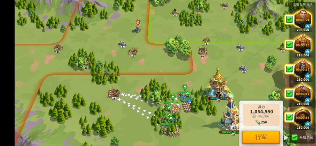 同样,当屏幕上存在多支部队,点击目标,也可以在部队栏使用“开启多选”,不用双击,也能指挥