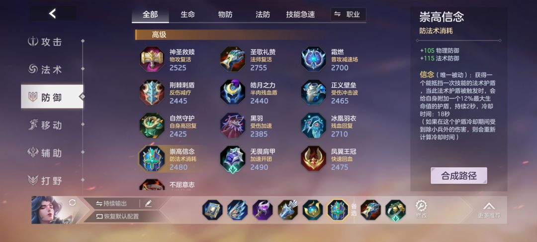 第五件和第六件装备选择降魔宝珠或者崇高信念,请根据战城格局选择,如果你感觉你的伤害够,但是害怕对面刺客瞬间切入秒掉你,可以优先选择崇高信念,如果对面刺客没有理你,则可以补出降魔宝珠,打出更高的伤害