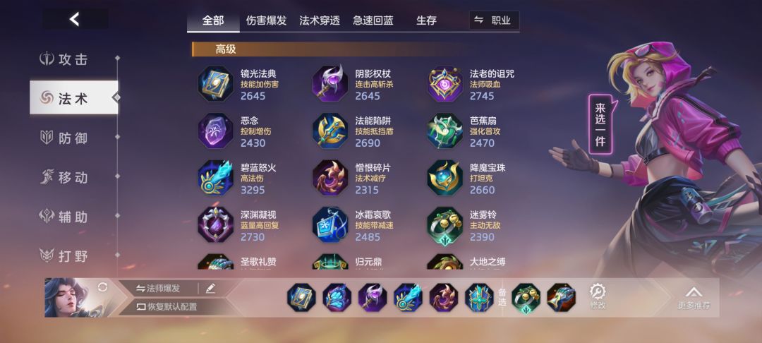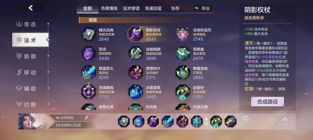在装备选择上,相信我这个出装已经是大部分诸葛亮的出装,在前期选择阴影权杖的超高爆发扩大优势,在中期补出镜光法典,再结合小地图去抓取敌人关键性位置切杀