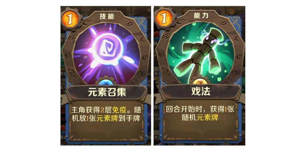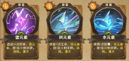 元素卡是“水→风→火→铁→雷→水”的循环生成,其中水元素负责回能量,风元素负责回血量,雷元素负责主要输出
