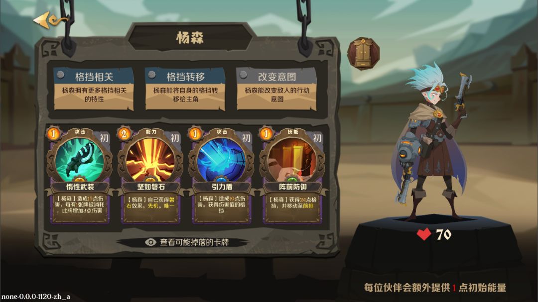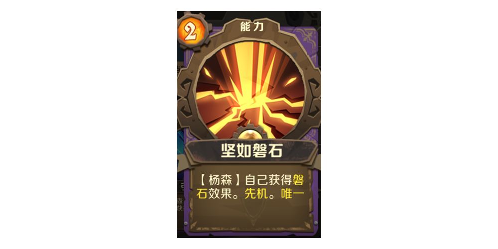杨森的初始卡牌“坚如磐石”自带先机,打出后配合“铁元素”,可以积攒大量的格挡值,是个非常优秀的前排肉盾