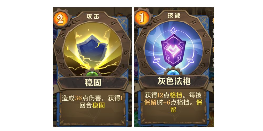“灰色法袍”自带保留效果,每次保留时能会增加格挡值,是关键时刻的保命神卡