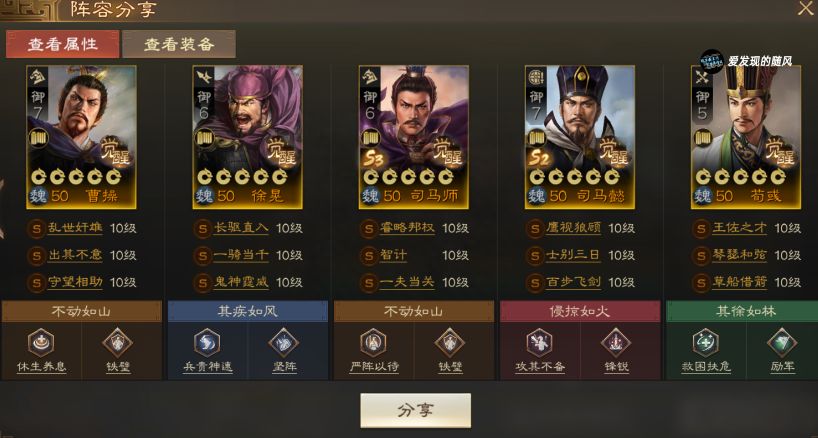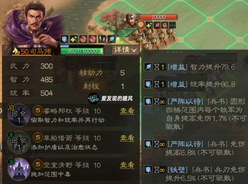 2.智计+减伤战法司马师自带战法配合智计,能将敌人的武力智力降得极低,这里的减伤战法可以携带一夫当关,进一步削弱敌方输出。