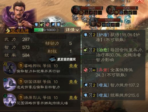 吸到四个人直接起飞,能提高197.2点的智力和215.6的统率属性!(可以看到统率吸收到的属性明显比智力多,可能是因为这个战法是先结算偷到的智力属性,然后根据这个智力属性去偷统率值,所以会相对高一些)但是和姜维不同的是,他这个战法是可以被驱散的,包括他吸别人的buff和敌人身上的debuff,所以也没那么无敌。