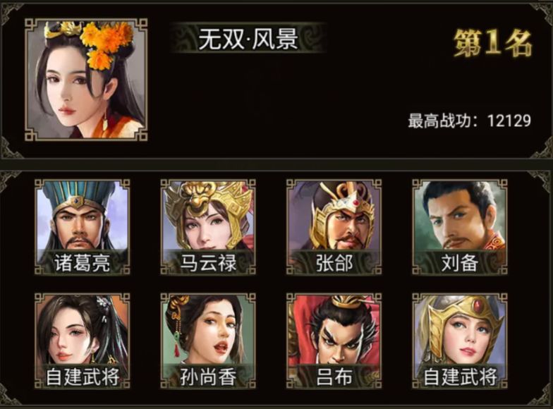 诸葛亮、马云禄、张郃、刘备、孙尚香、吕布、陈到、赵云和两位自建武将