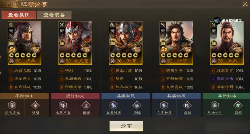 周泰首回合给到周瑜历战之躯后,携带双增伤战法每回合为队友提供高额增伤。这里大乔和陆逊都是有携带减伤战法提高生存能力的,吕蒙能隐身,周瑜被分摊,每个人都很难杀,而伤害又不低。