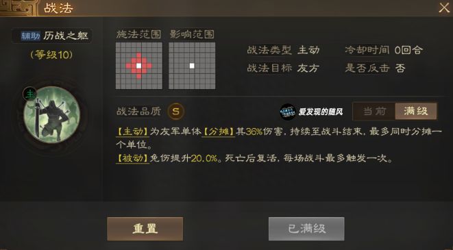 自带战法【历战之躯】,有两层效果:1)主动效果:能为友军单体分摊36%伤害持续至战斗结束,但只能分摊一个单位。2)被动效果:免伤提升20%,死亡后复活,最多触发一次。