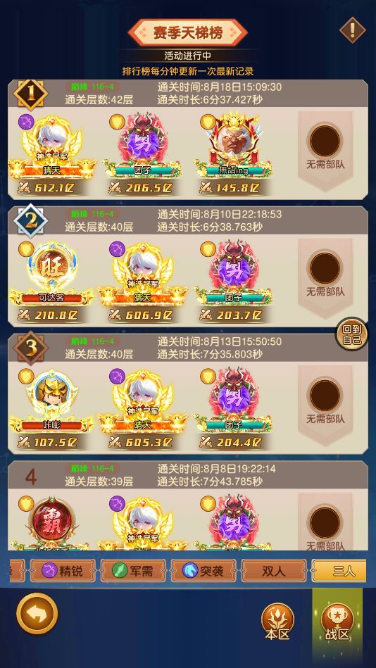精锐-赛季天梯榜:【116-1 小糖豆】591亿战力 通关56层用时 7分15秒