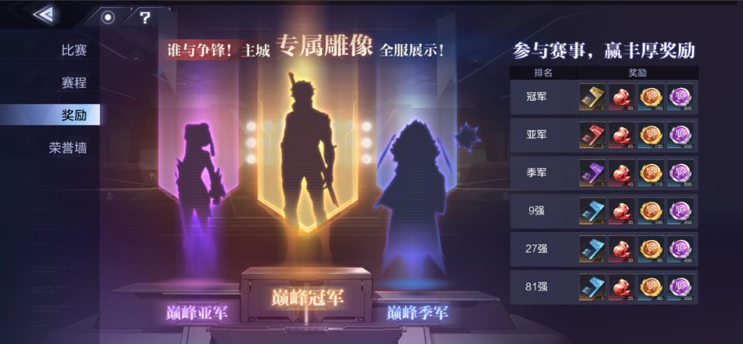 6. 根据玩家在决赛中的成绩,分为81强、27强、9强、季军、亚军、冠军,并根据最终成绩发放奖励。
