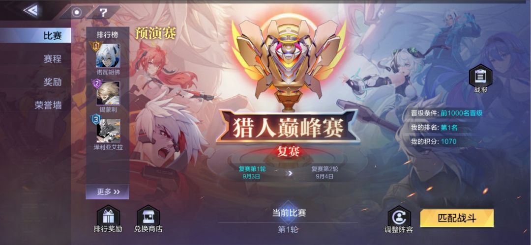 2. 初赛中成功晋级的玩家可参与复赛第1轮比赛,在规定的匹配时间段内,进行不限次数的匹配,并进行积分排名。复赛第1轮结算时,排名靠前的玩家晋级复赛第2轮,并根据排名发放排名奖励。