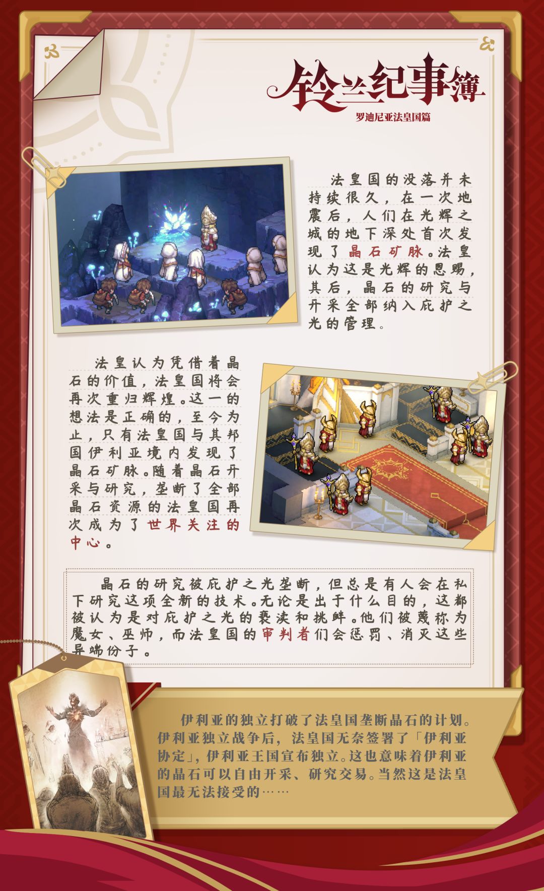 一次地震后,法皇国的人民在地下深处发现了晶石矿脉。法皇将其称为“光辉的恩赐”,派庇护之光管理晶石的研究与开采工作。法皇坚信,凭借这一资源,法皇国可以重归辉煌。