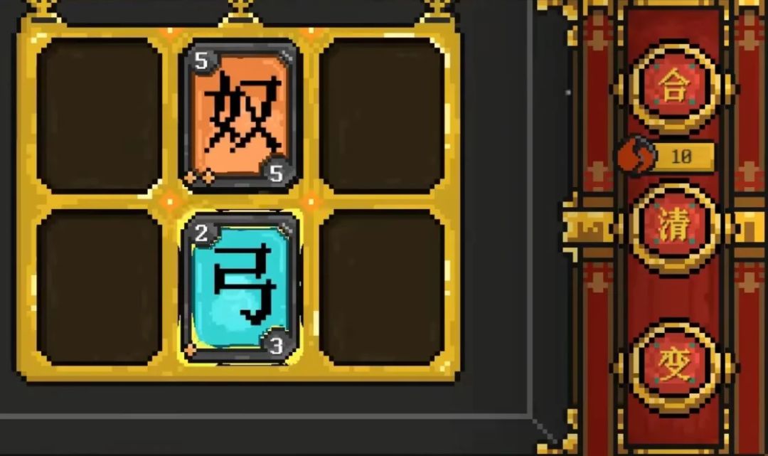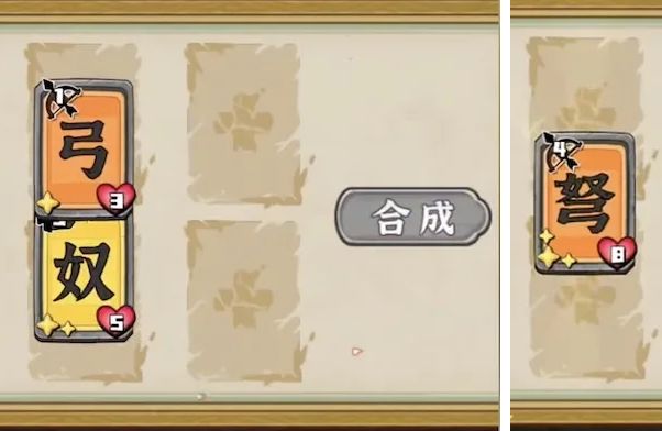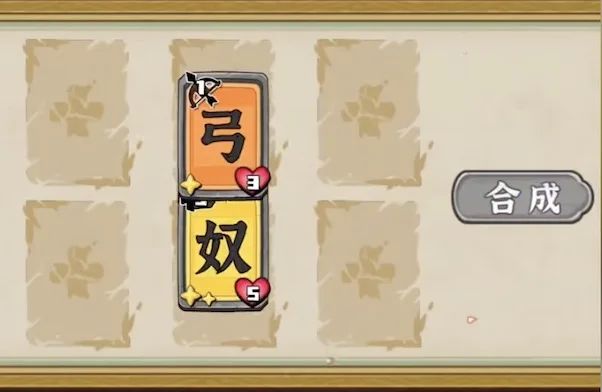 不同文字也代表了这张牌的性质。比如「弓」字代表的就是「弓箭🏹」,具有远程攻击特性;「奴」字代表「奴隶」,只是一般的低级作战单位。二者合一成了「弩」,血量、攻击均有提升,卡牌也成了「弩箭」,战力理所当然更强大。