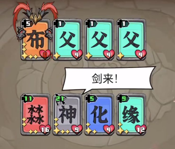 每个字的笔画数量,即是卡牌的初始生命值;不同汉字卡牌组合,将生成一个新的卡牌。
