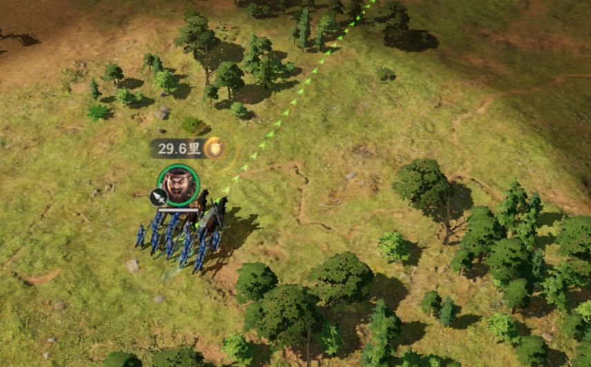 3、当部曲距离孔明灯二十里以内时,部曲上方会出现指向孔明灯的箭头,朝箭头方向行军,即可寻找到孔明灯。因为距离越来越近了,也可以在部队行军的时候缩小地图,查看周围的孔明灯情况,绿色的孔明灯就是主公您个人的孔明灯啦。