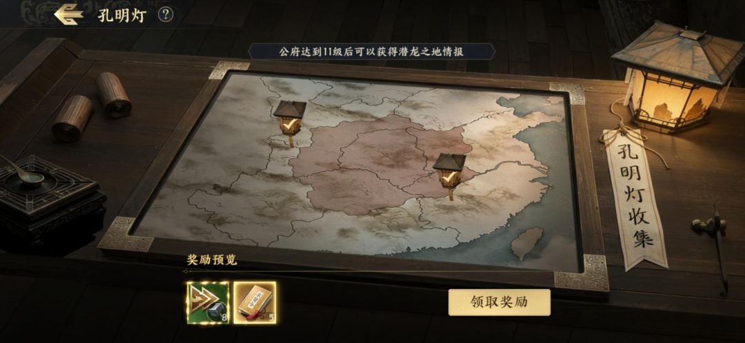 当玩家公府达到9级后将开启寻找孔明灯玩法,根据不同公府不同等级将在地图上刷新出不等数量的孔明灯。