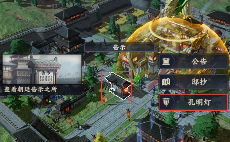 玩法入口您可以通过点击公府内的告示牌进入孔明灯玩法界面,进入后可以看到您已经刷新的孔明灯数量、所在方位,收集进度和奖励预览等内容。