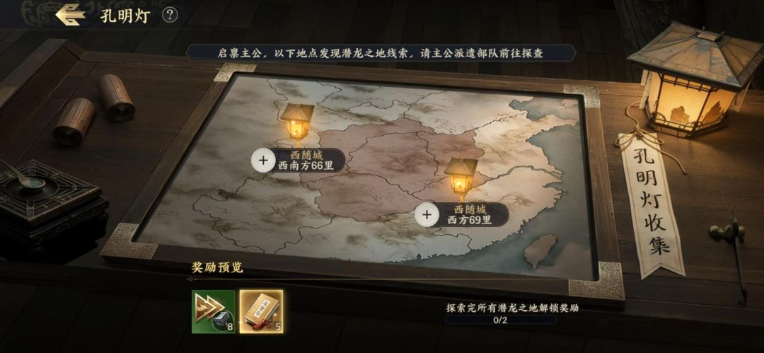 4、当部队到达孔明灯位置的时候,点击孔明灯收集就可以获得2个潜龙宝箱,每个潜龙宝箱可获得50银淀。收集满当前等级的孔明灯数量后可以返回公示牌-孔明灯界面领取收集奖励哦。