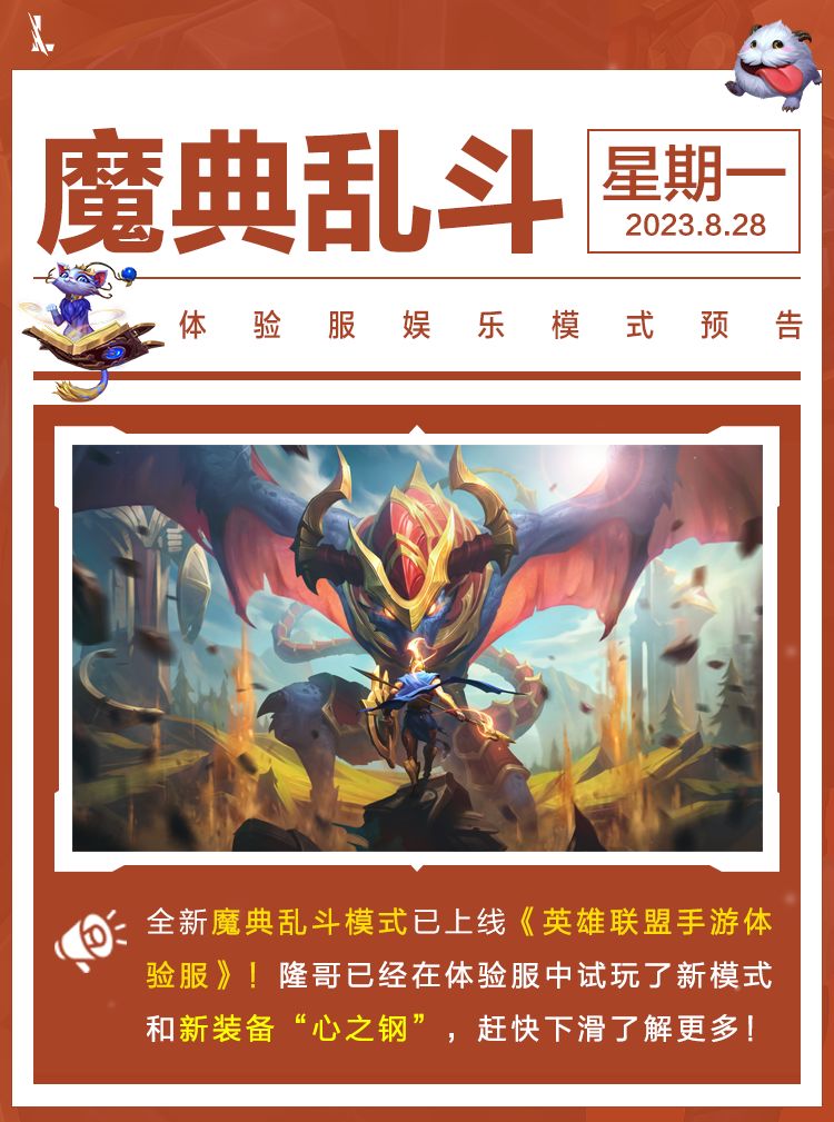 召唤师们之前一直心心念念的娱乐模式魔典大乱斗已经在体验服开放啦!该模式是终极魔典和极地大乱斗玩法的结合,并且还有独特新装备“心之钢”的助阵~隆哥已带来前方第一手资料,快来瞧瞧吧~
