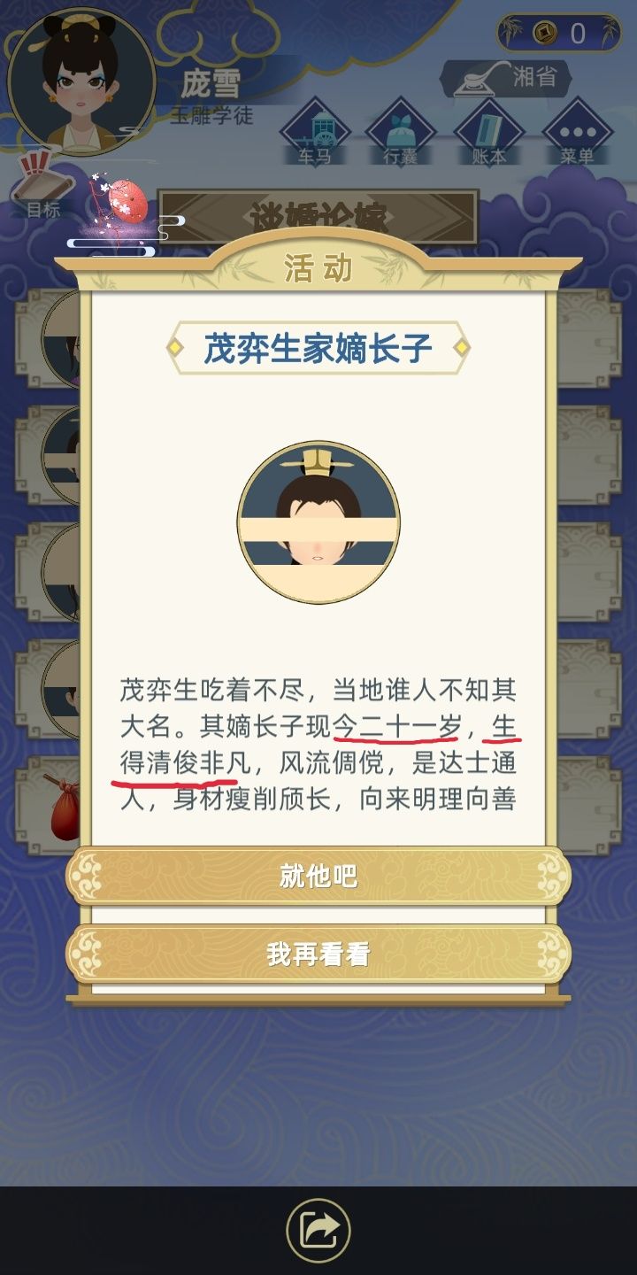 然后就是男线,我第一次试是刚好遇到合适的,又刚好是金瞳。这次父母介绍的一个没相中,去媒婆那找的时候年龄大了,第一个老婆年龄大了就翻车了,但至少也是倾国倾城是不是![[嗒啦啦2_摸摸头]](https://img.tapimg.com/market/images/af4f8dad9187e6e4c3ecd7b524f0155c.gif)