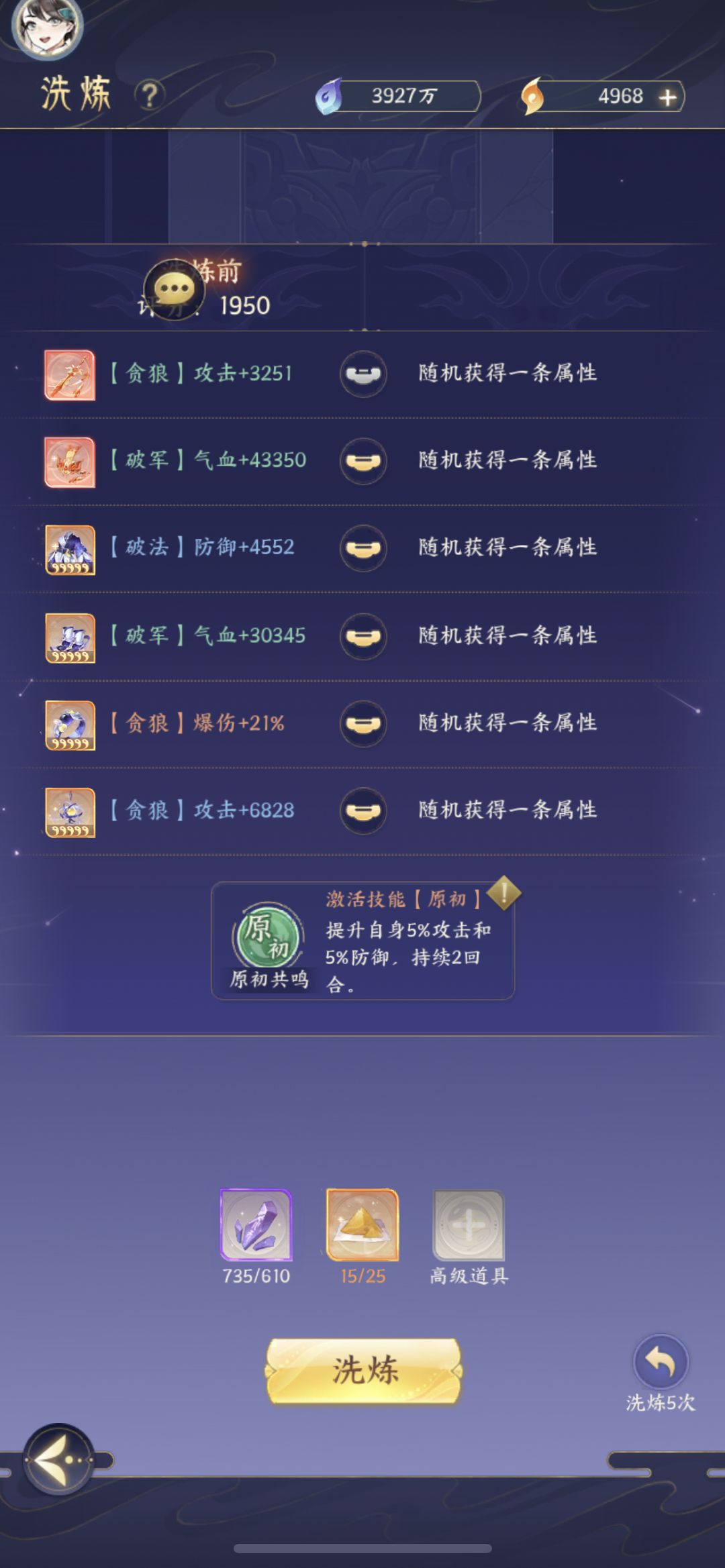 刷了将近500个石头,总共刷出来过三次橙词条,这个“贪狼”最好就留他了。