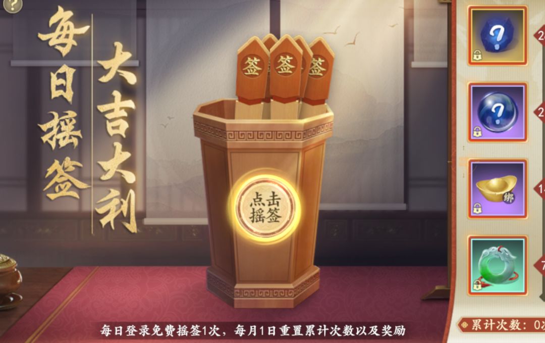 开启游戏后不要忘了每日登录来摇签,看看今日运势,算算什么时候才能称霸武林!还可获得实用游戏道具等惊喜哦~