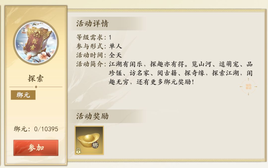 探索江湖拿元宝,你看的每一处风景都绝对值得!探索游戏获得的收益随着玩家等级提升而提升,最高可以免费获得10000+绑元,只要逛一逛,绑元拿到满!除了绑元,还有精美时装奖励等你领取~