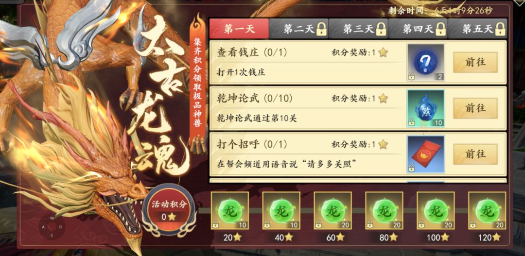 进入游戏后,少侠们记得开启神龙吟任务,持续7日,共解锁五天的玩法指引里程碑。完成任务即可轻松获得太古龙魂,集满100龙魂可直接召唤出强大的神兽-太古龙魂;珍兽分为普通、特殊、神兽,其中神兽可是最高档次的存在。首周即送顶级神兽,这个待遇就说“顶”不“顶”吧!