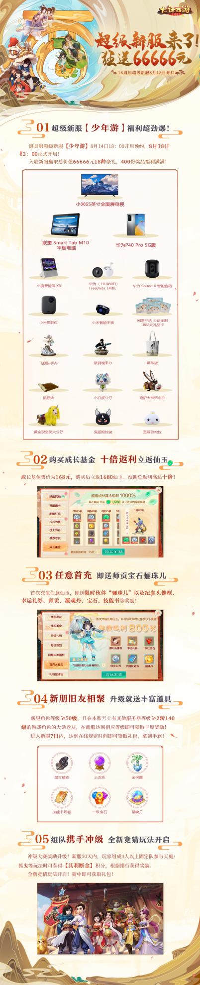 8月18日,大话手游道具服新服【少年游】将正式上线,海量实物奖励即将分批送出,小米65英寸全面屏大电视、联想平板电脑、华为P40 Pro5G手机等数码产品,飞剑侠手办、鸡驴纸巾抽、《大话之少年游》限定周边等实物大礼统统大放送!