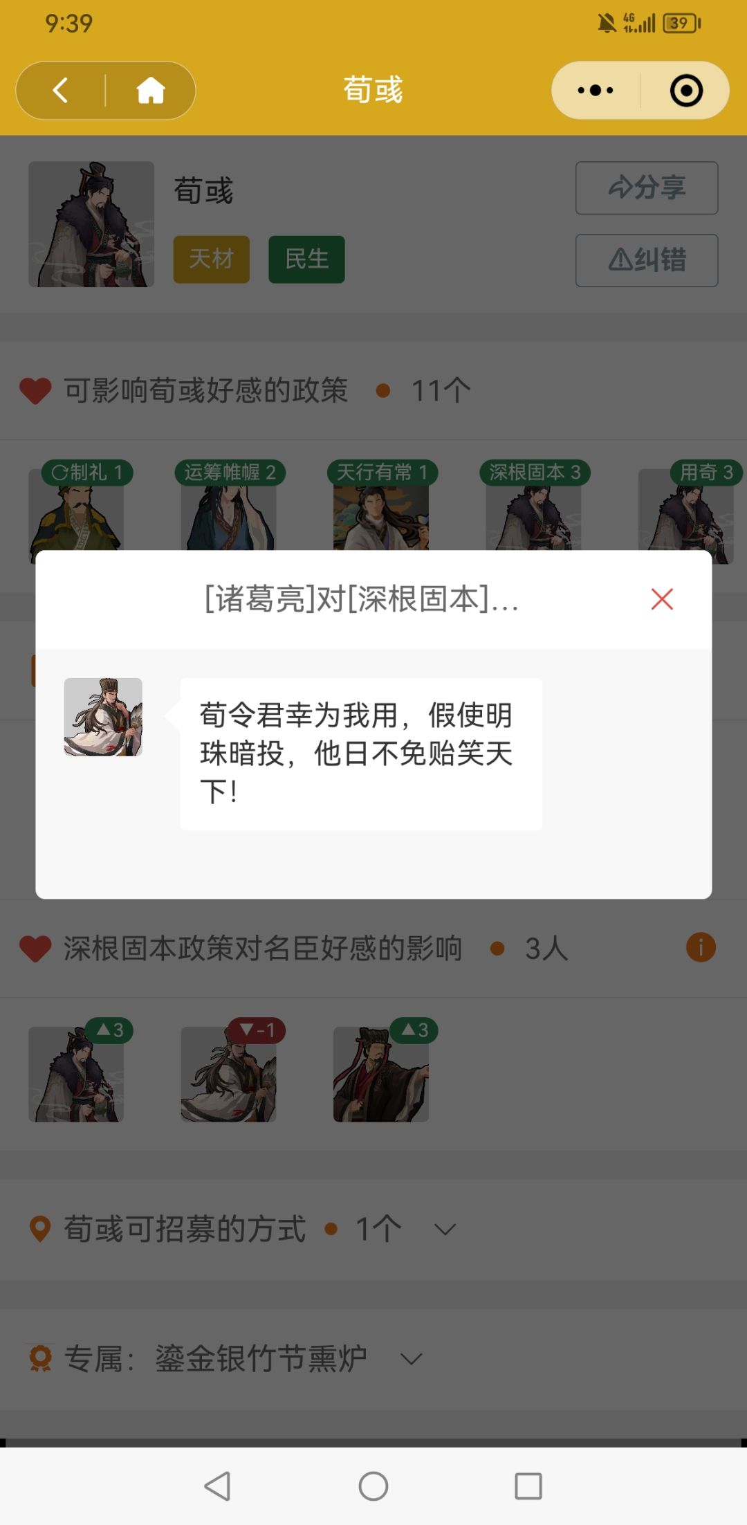 顺带一提,现在【无悔营地】更新了名臣政策的评价语,类似底下的诸葛亮对于荀彧深根固本的评价,所以也欢迎使用微信小程序【无悔营地】来进行查询~