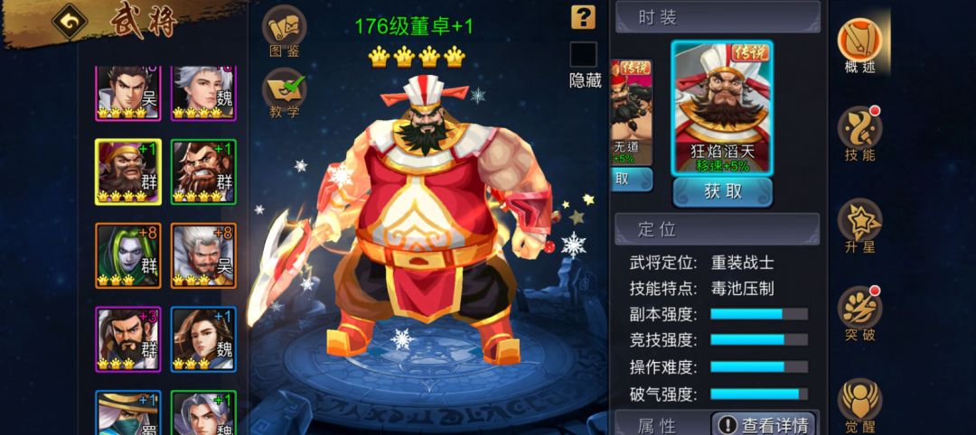 太师董卓被系统定义为:重装战士,技能特点为毒池压制,副本强度和竞技强度总体持平,操作难度适中,破气强度尚佳但经过一系列考量后得知:其竞技强度远高于副本能力。