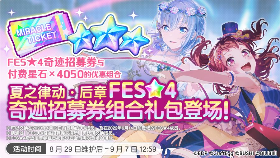 ※本期「夏之律动FES★4奇迹招募券交换所」将于9月22日12:59关闭,关闭后,「FES★4奇迹招募券」将无法使用,敬请注意。