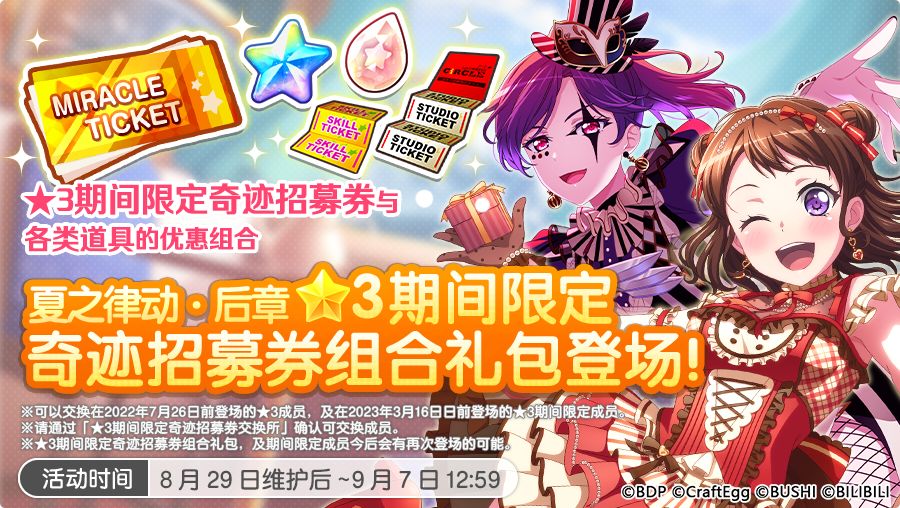 ※「★3期间限定奇迹招募券」可在「★3期间限定奇迹招募券兑换所」中自选1名2022年7月26日前登场过的★3期间限定成员或2023年3月16日前登场过的★3成员。