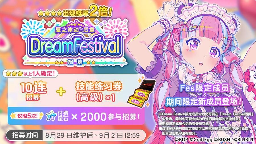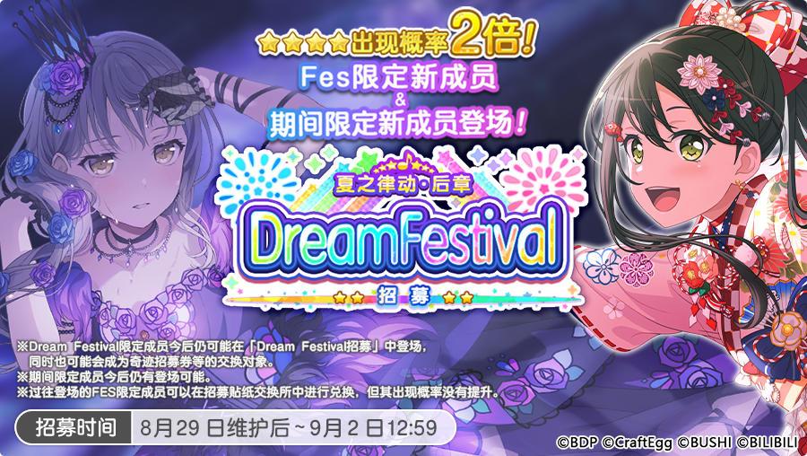 PS:9月2日「夏之律动·后章 Dream Festival招募」结束后,游戏内将开启「招福!祝颂的初阳招募」,新登场期间限定成员将在此招募中登场,Dream Festival限定成员不会在以上招募登场。