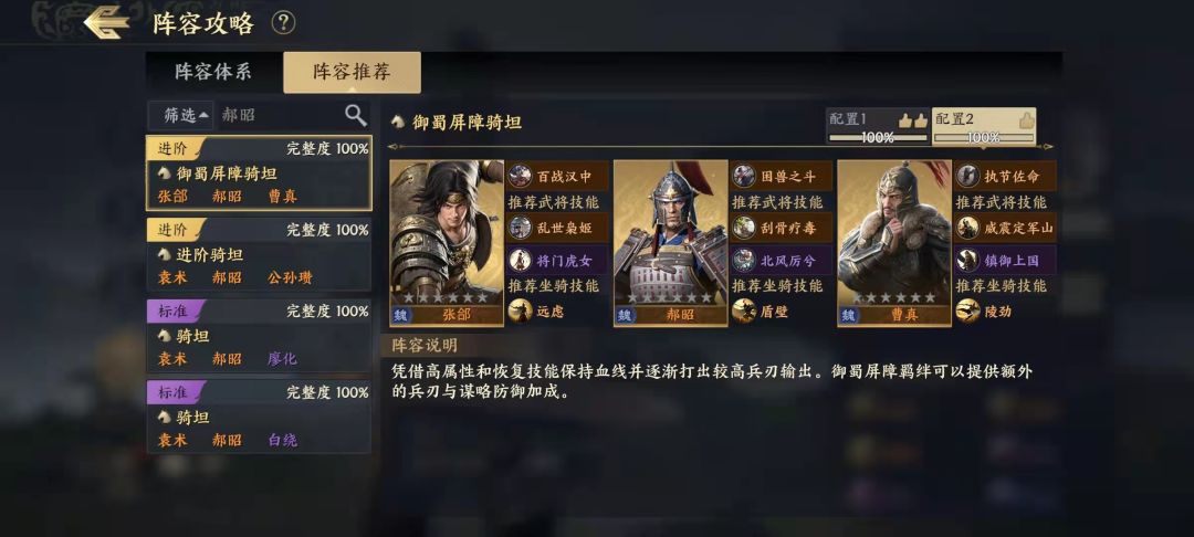 备选推荐:橙将可替换为郝昭或者张郃。公孙瓒和袁术亦可以使用,但由于没有羁绊,强度有所降低。技能可选用【将门虎女】、【镇御上国】等紫色连击技能过渡。