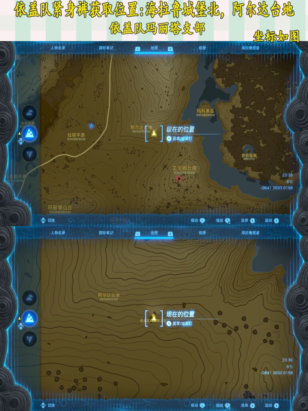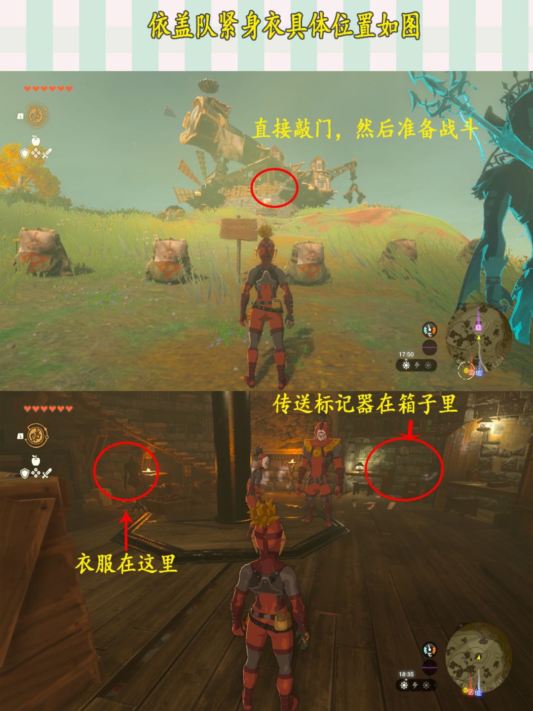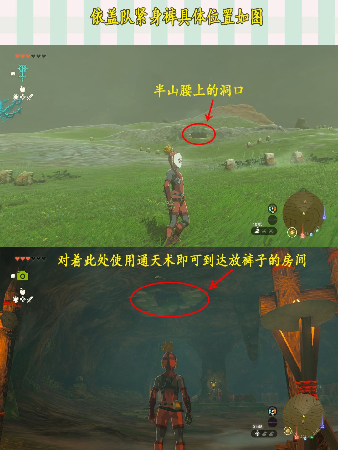图5,6:依盖队紧身裤如图5,位于海拉鲁城堡北边的阿尔达台地上,这个位置比较空旷,且有高低差,所以可能不太好找,所幸这个地方小怪不多,所以各位同学可以慢慢找,进去后对付完依盖队员,在如图6的地方使用通天术就能到达存放紧身裤的房间啦,在图6房间右上有个被箱子挡住的房间,里面有依盖队最爱的补给(大剑香蕉)香蕉