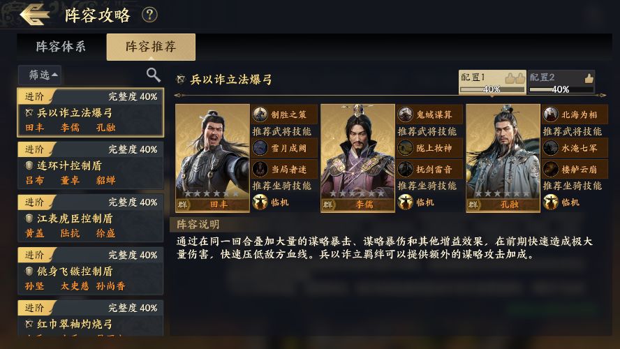 进阶法爆弓,其中李儒、孔融可以在前期通过基础卡池招募获得,田丰在天下大势第二阶段解锁的限时卡池可招募获得。这套阵容可触发兵以诈立羁绊,使得所在部曲谋略攻击提升11%,非常直观的法爆伤害提升。同时田丰自带技能【制胜之策】的禁疗可以削弱孔融【北海为相】给敌方恢复兵力负面效果带来的影响,两个技能完美契合。