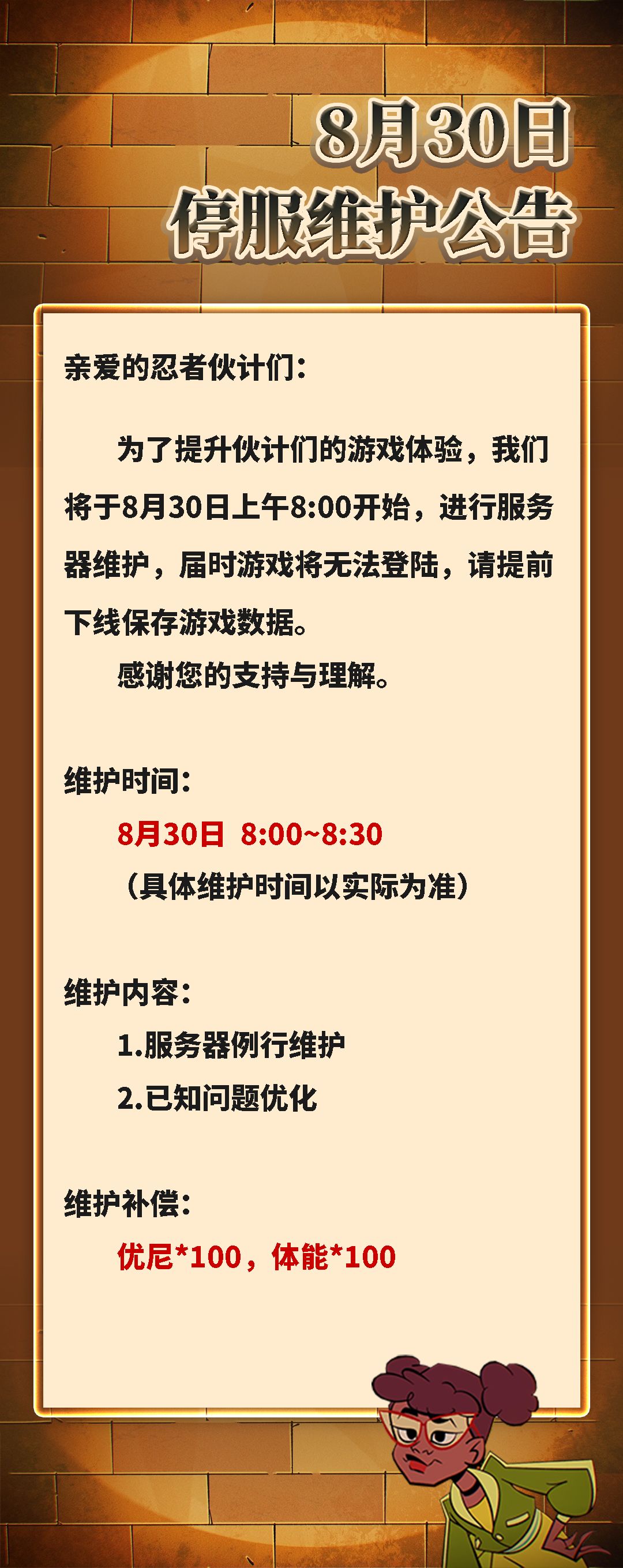 为了提升伙计们的游戏体验,我们将于8月30日8点开始,进行服务器维护,届时游戏将无法登陆,请提前下线,感谢您的支持与理解。