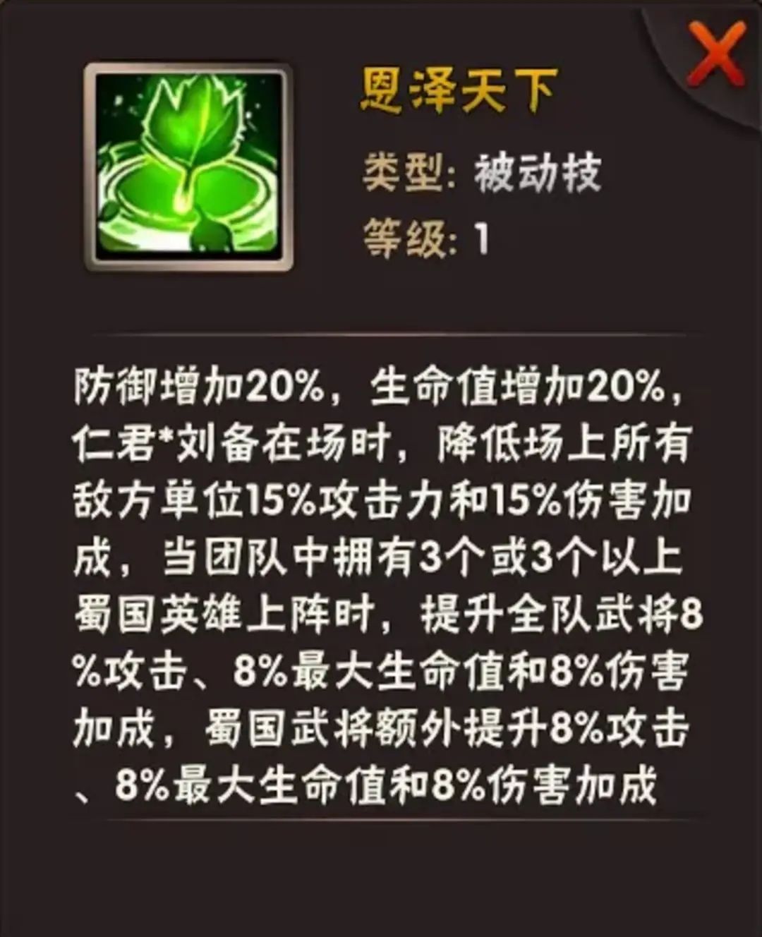 增加防御力与生命值,仁君刘备在场时,降低场上所有敌方单位15%攻击力和15%伤害加成,当团队中拥有3个或3个以上蜀国武将上阵时,提升全队武将8%攻击、8%最大生命值和8%伤害加成,蜀国武将将额外提升8%攻击、8%最大生命值和8%伤害加成。