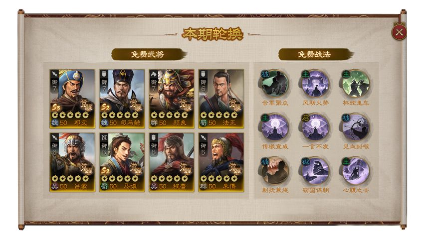 (以上限免武将和战法仅为展示作用,请以测试上线正式限免武将战法为准)