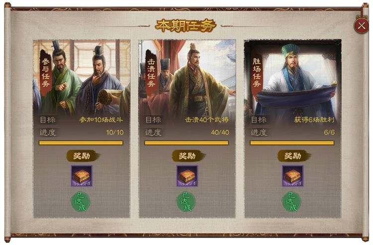 2.每周挑战任务轻松领取宝箱每周完成挑战任务,即可领取比武争锋宝箱3个。宝箱中可以随机获得100至500金铢、招募信、经验继承券、武库银秘钥。
