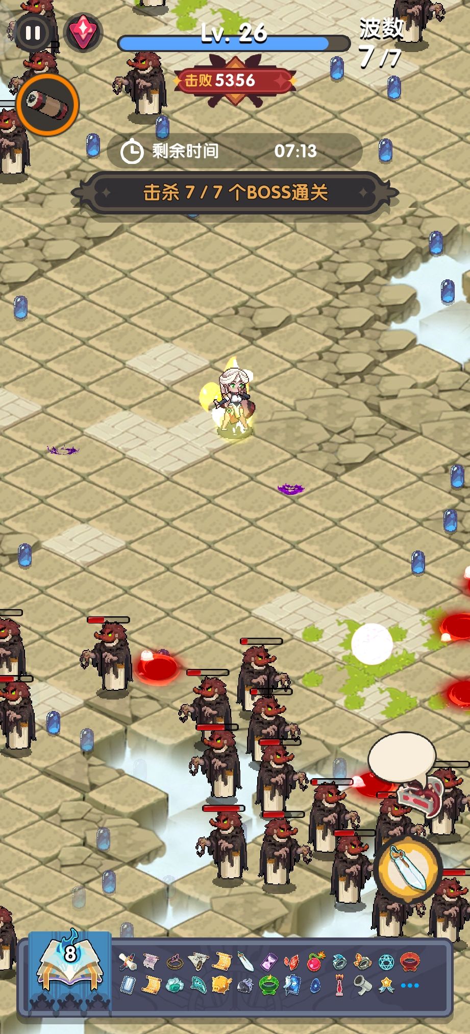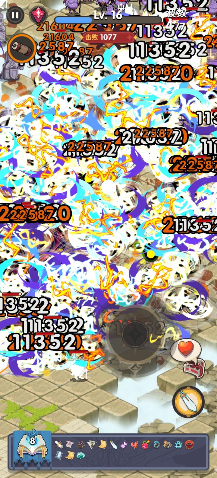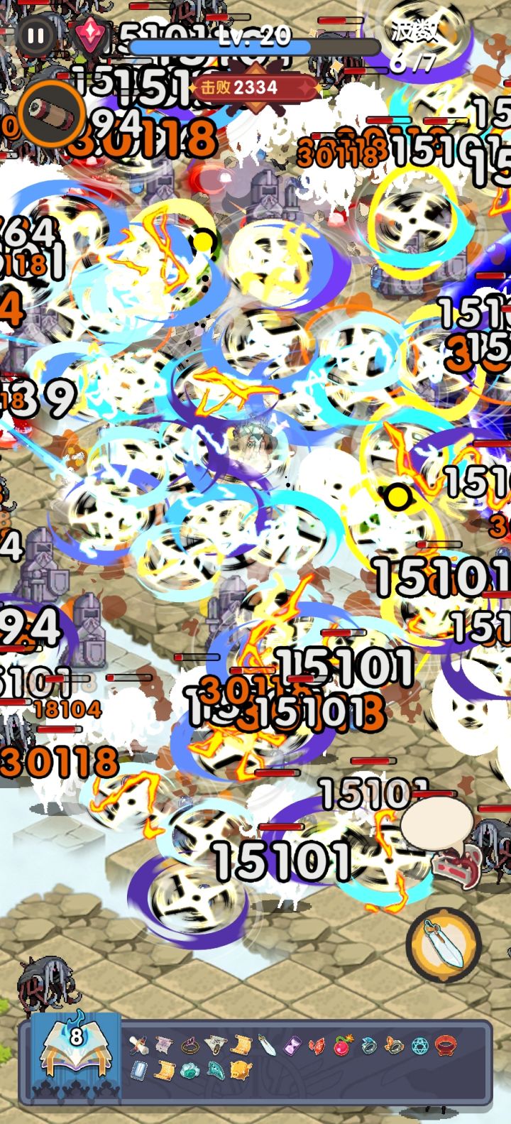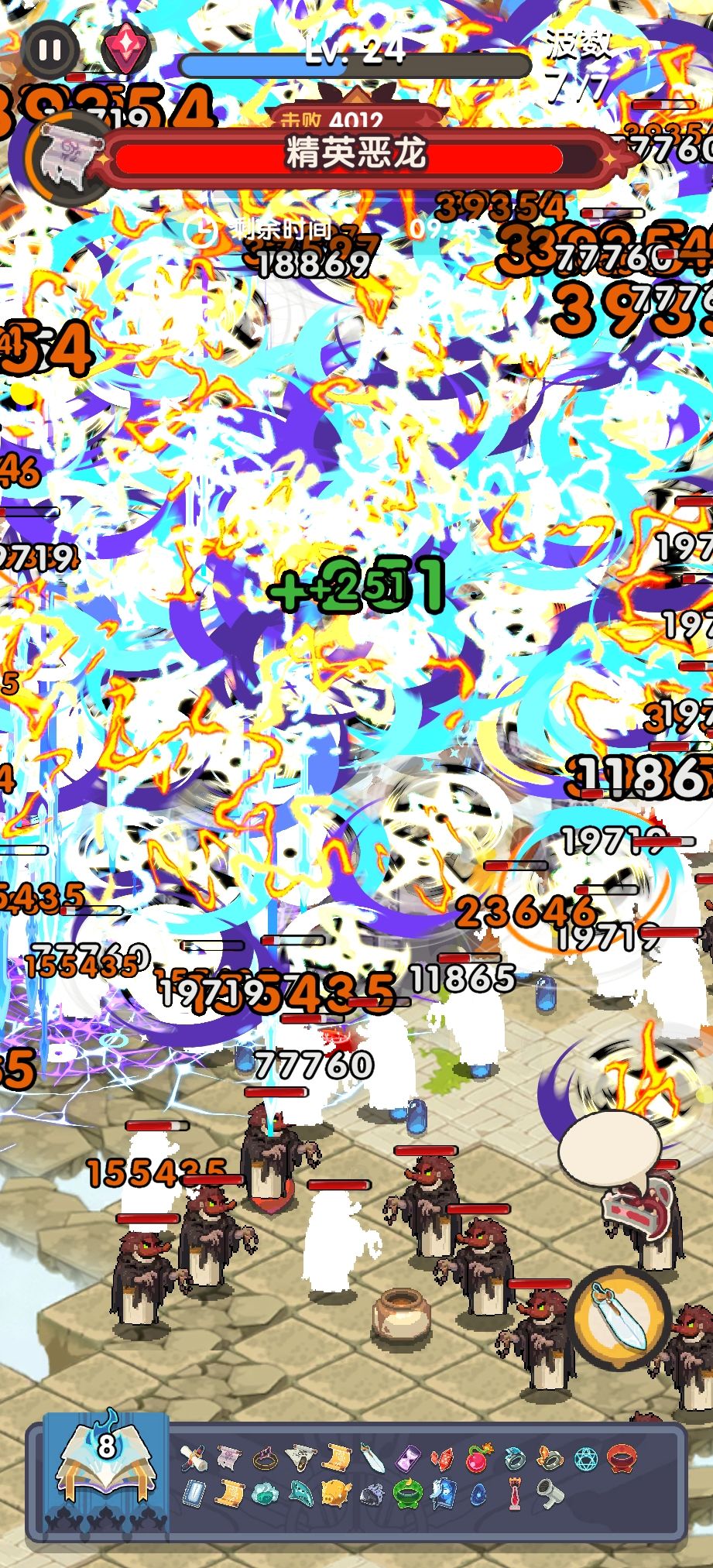 于是我就崩溃了,全程看不到怪,等同于盲打(图2345)。如果只是看不到怪就算了,怪物死亡血液和天上掉落的毒液也看不到。这中间石兵不知帮我挡下了多少攻击,吓得我御剑也不敢升了,抢先把石兵升到6。后来又来了一个石兵+3,心里稍微稳了点,慢慢的才把御剑升到奥义。终于在第七波boss刷出来三分钟之后,通过了这一层