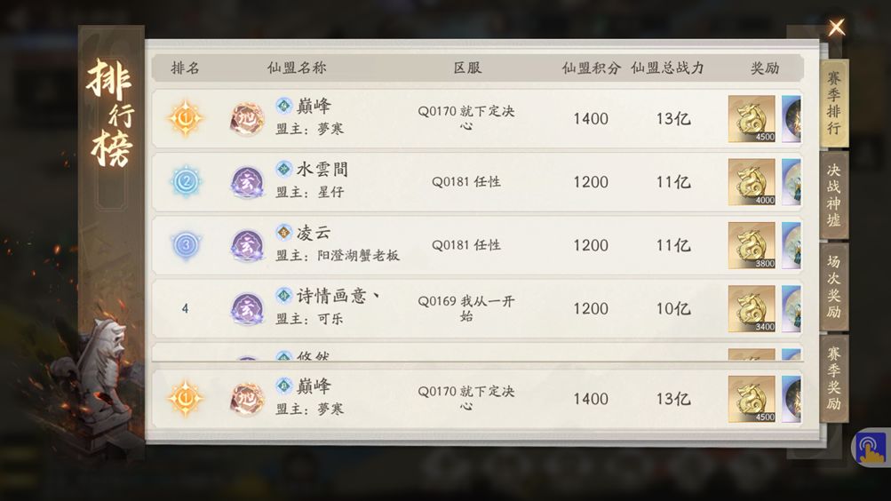 每周的战场会按照仙盟积分排序(同积分的情况下再按照仙盟战力高低排序)。